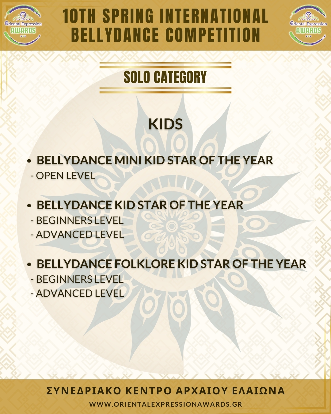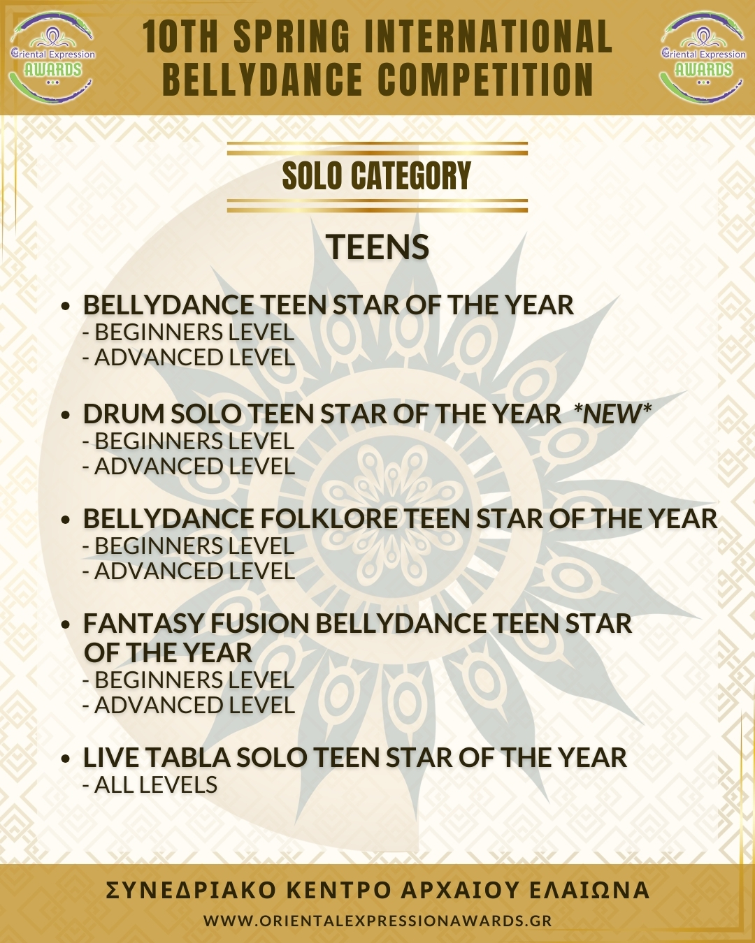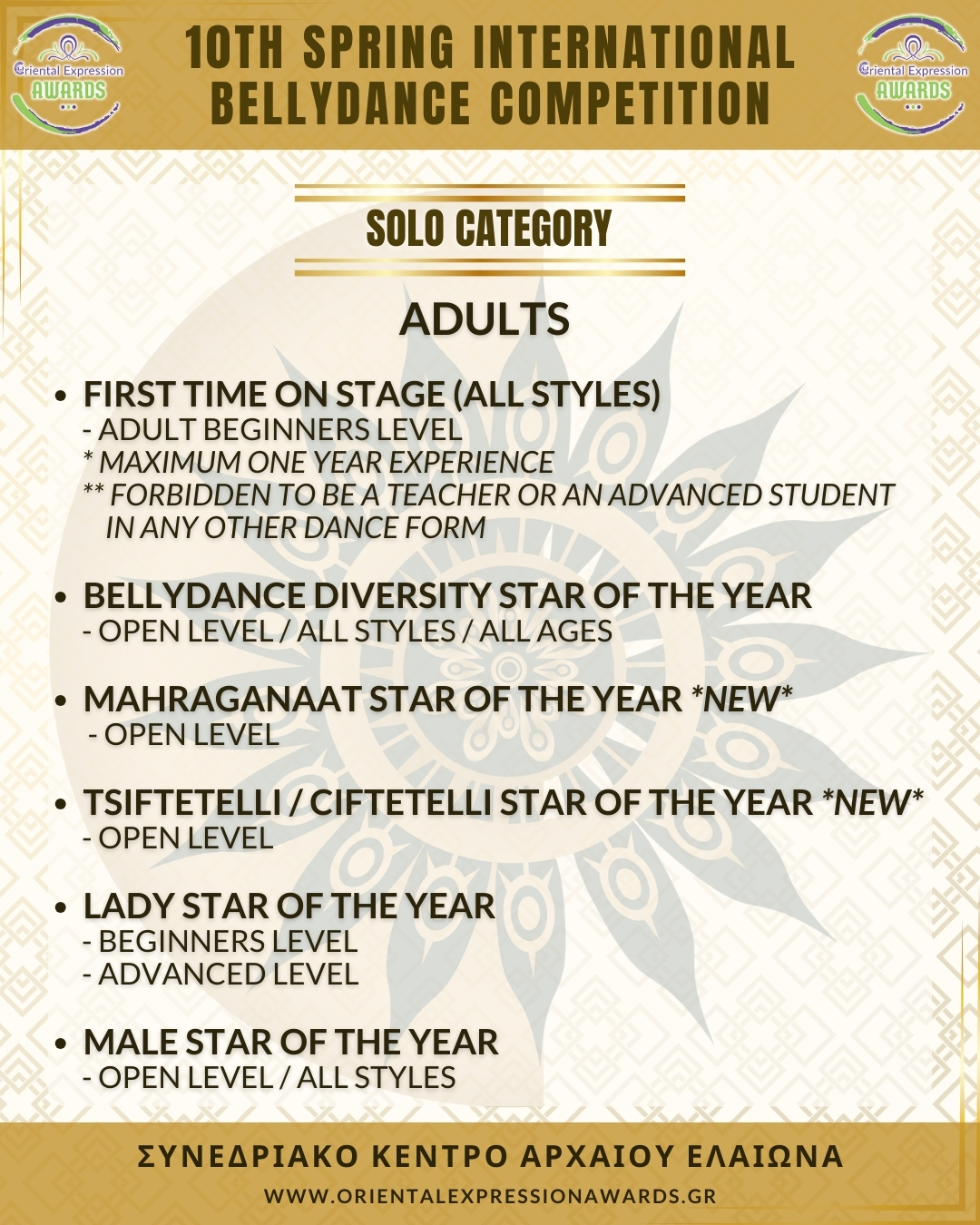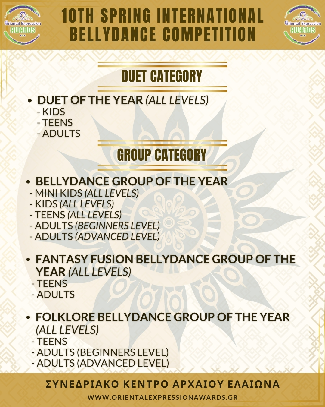 Participation in 4 required categories (Drum Solo Advance - Folklore Advance - Bellydance Star - Crown)